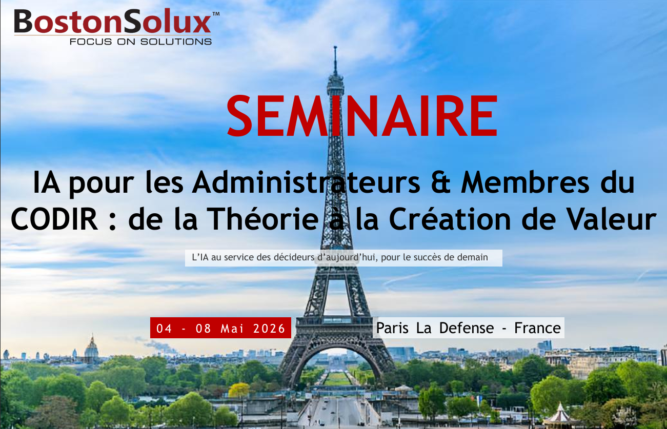 C’est à partir de ce constat que BostonSolux a conçu un séminaire exclusivement destiné aux Administrateurs, membres de CODIR et Directions Générales, avec pour objectif d’aider les dirigeants à passer d’une approche théorique de l’IA à une création de valeur réelle, maîtrisée et alignée sur la stratégie.
